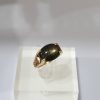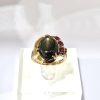 This striking vintage ring features a captivating black star sapphire as its centerpiece, its polished cabochon surface revealing a radiant, star-like glow. Flanking the sapphire are two vibrant rubies, adding a lively pop of color and sophistication. The wide gold band is adorned with an intricate ribbed texture, providing a bold yet refined foundation that enhances the ring’s vintage charm. Subtle leaf-like details frame the gemstones, adding an organic touch to the design. This harmonious blend of textures, colors, and artistry creates a timeless piece that embodies elegance and exceptional craftsmanship, perfect for those with a taste for classic beauty.